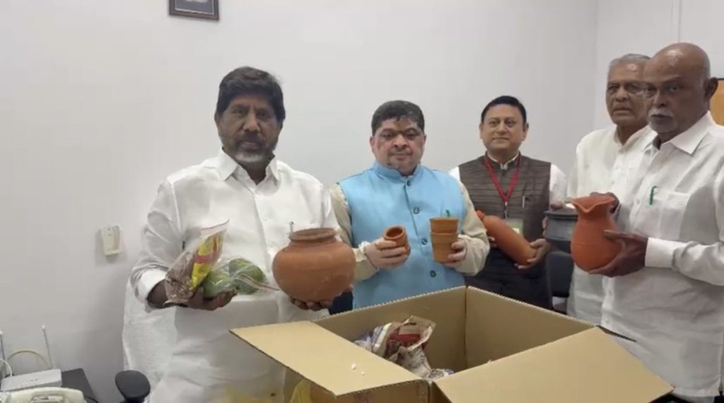 మట్టి పాత్రలు ఉపయోగించి ప్రజలు తమ ఆరోగ్యాన్ని కాపాడుకోవాలని పొన్నం ప్రభాకర్ సూచించారు. శ్రీపరాభవ నామ సంవత్సర ఉగాది పురస్కరించుకొని ”మట్టి పాత్రలు వాడండి ఆరోగ్యాన్ని కాపాడుకోండి కుల వృత్తులను ప్రోత్సహించండి” నినాదంతో అసెంబ్లీ ఆవరణలో చైర్మన్ గుత్తా సుఖేందర్ రెడ్డి, స్పీకర్ గడ్డం ప్రసాద్ కుమార్ , డిప్యూటీ సీఎం భట్టి విక్రమార్కకు ఉగాది కిట్ అందజేశారు.